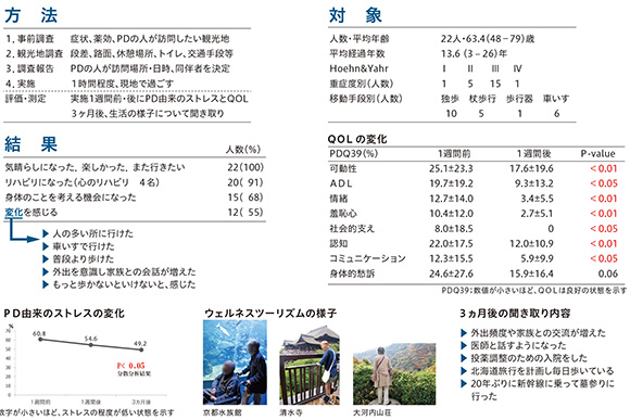 - 京都の観光資源を活用したウェルネスツーリズムは、PDの人の病気由来のストレスを軽減し、QOLの維持向上に効果がある。
