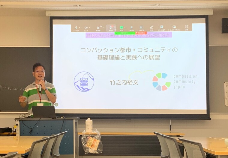 今回は、「コンパッション都市・コミュニティの基礎理論と実践への展望」というテーマで、静岡大学教授の竹之内裕文先生にご講演いただきました。