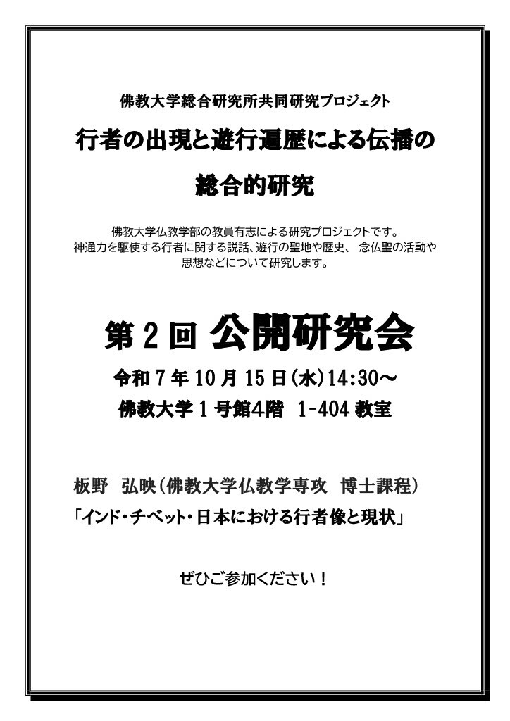 佛教大学総合研究所(京都市北区)は共同研究プロジェクト「行者の出現と遊行遍歴による伝播の総合的研究」(研究代表 齋藤蒙光 仏教学部准教授)において、第2回公開研究会「インド・チベット・日本における行者像と現状」を10月15日(水)に佛教大学紫野キャンパスで開催します。ぜひご参加ください。