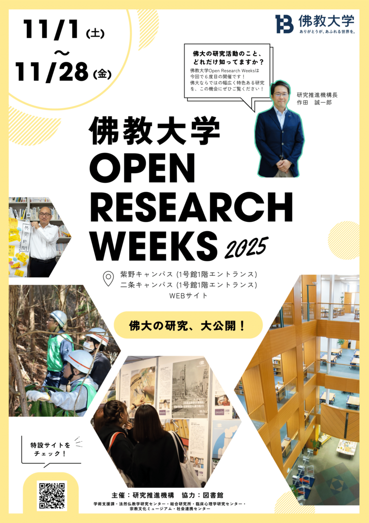 今年も佛教大学の様々な分野の研究や活動の成果を紹介する「佛教大学Open Research Weeks 2025」を以下の通り開催しています。研究推進機構の各課、附置機関からのポスターの展示の他、紫野キャンパスでは「洛中洛外図屏風(複製)」を展示しています。