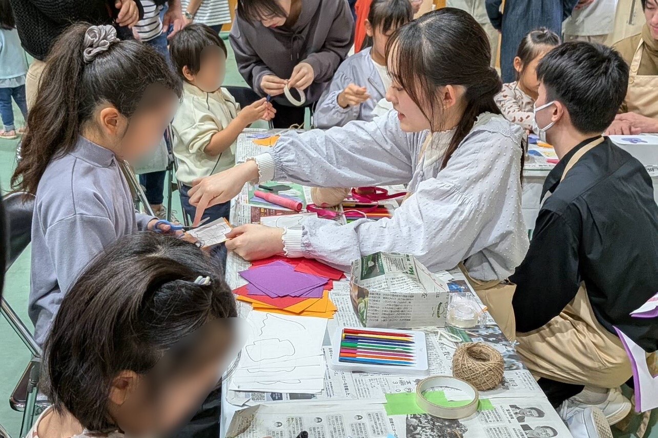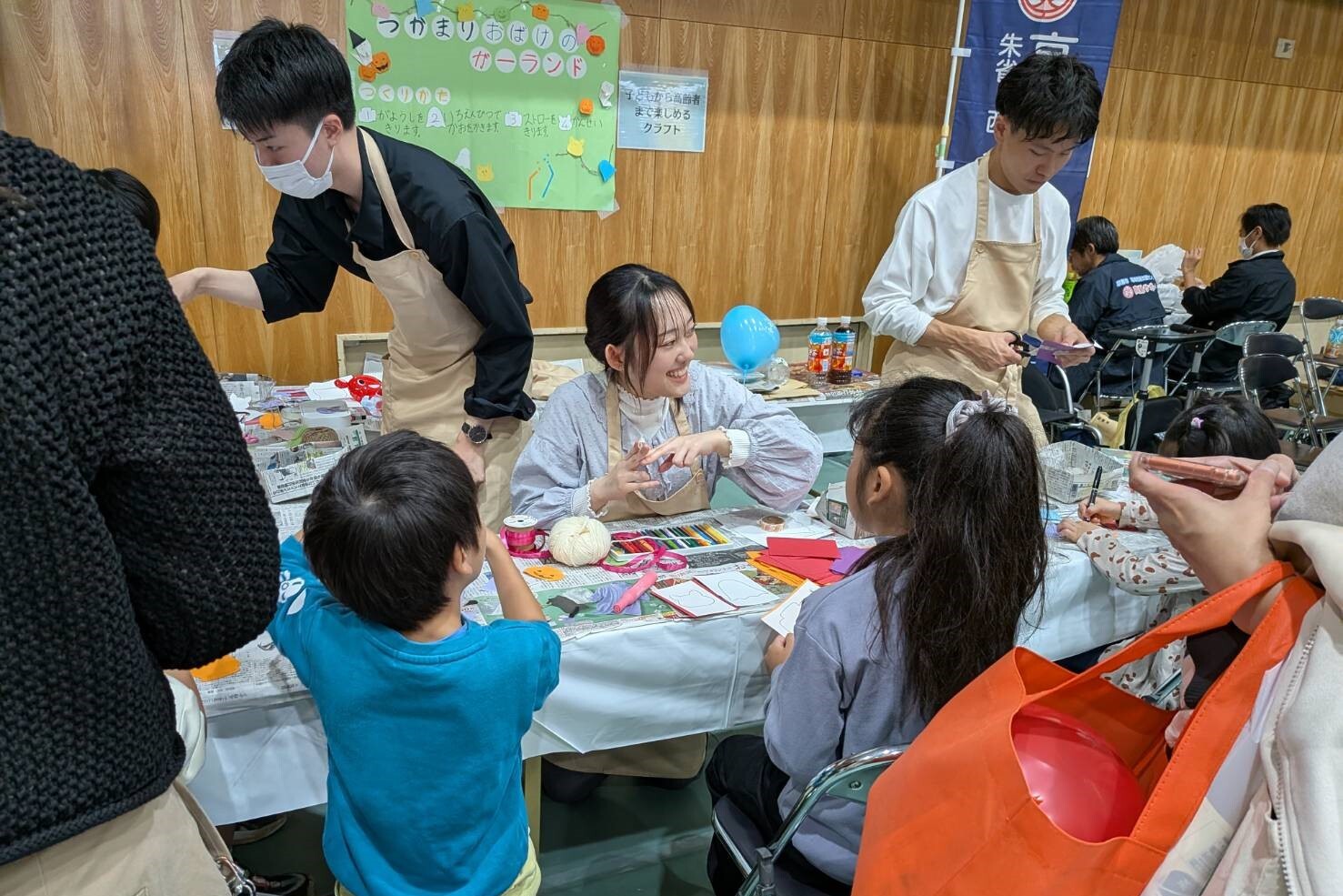 当日はあいにくの雨天でしたがブースは大盛況となり、地域の皆さまをはじめ多くの方に工作を楽しんでくださいました。学生たちは、休む間もなく子どもたちのサポートをしていました。