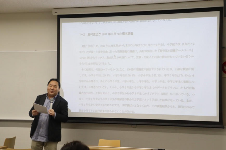 高校生を対象に実施した語彙量調査について、過去に行われてきた語彙量調査をふまえ、新しい調査方法を試みた結果明らかになった内容について報告されました。今回の研修で確立された調査法により、今後も調査対象を拡大し調査を進めていくことが示されました。