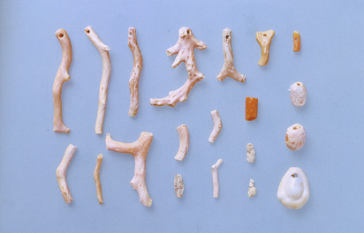 遺跡南方の工房付近で採集された。はるか彼方の地中海、またはインド洋から運ばれてきたサンゴ。女性たちの装飾品として利用されていたと考えられる。